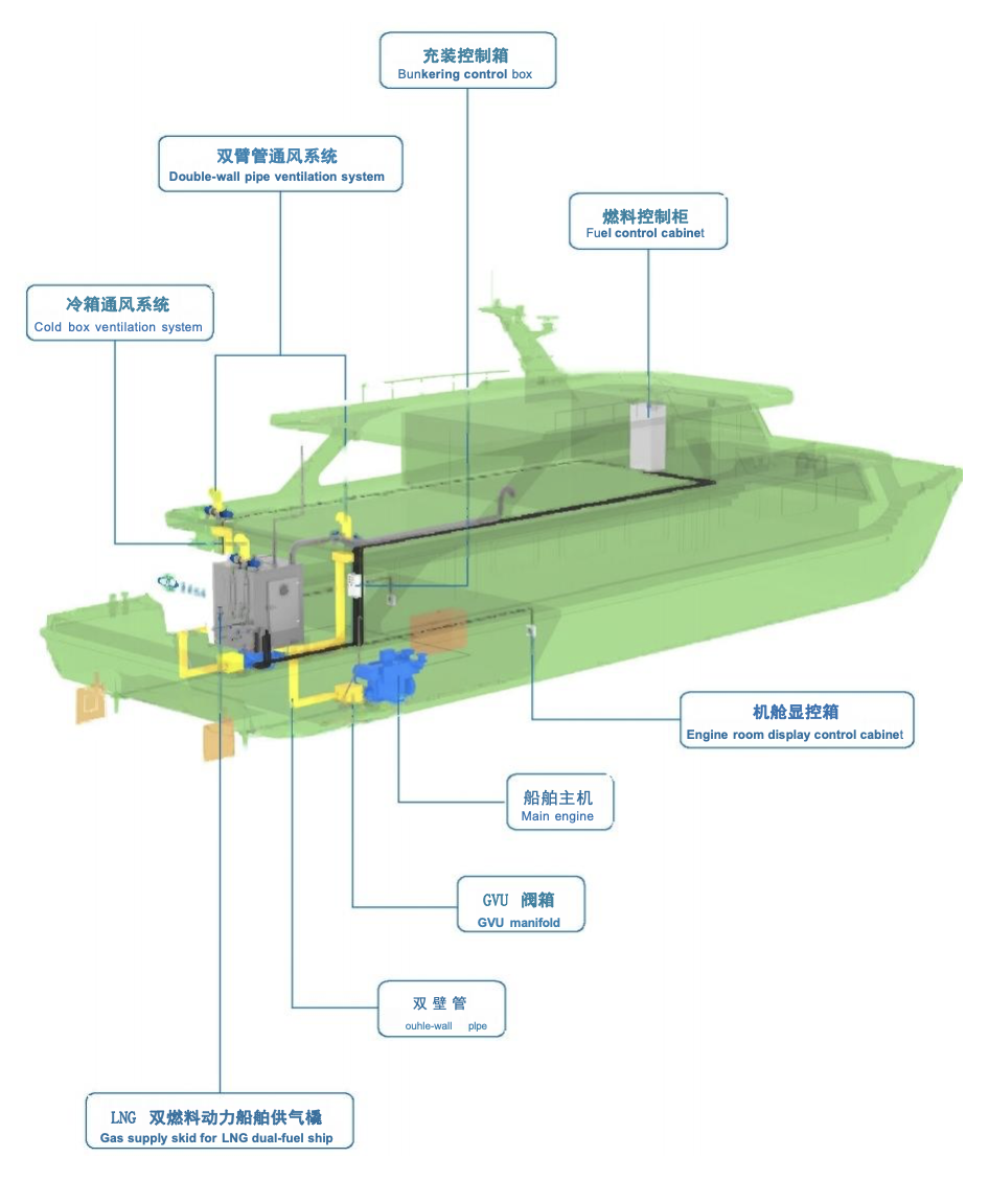 系统介绍:船舶LNG 燃料供气系统是专用于为船舶LNG 燃料主机供应燃料的系统。系统是以船载LNG 为原料,通过增 压、汽化等工艺流程,将液态的LNG 转变为可满足船舶主机进气要求的气体燃料,供给到主机燃烧做功,系统并辅以通 风、透气等辅助及安保等功能。